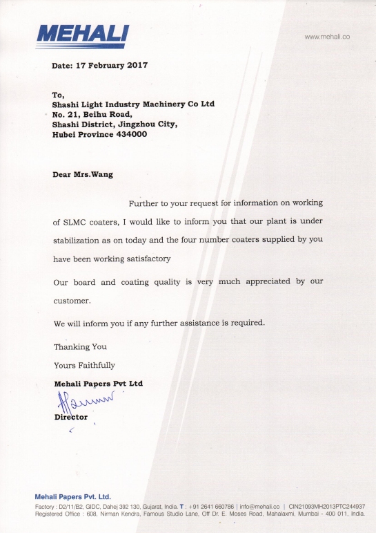 鸡年春节刚上班,公司就收到印度Mehali纸业公司发来的感谢信。信中,Mehali纸业公司对公司提供的4台涂布设备给予了高度评价:设备运行平稳,涂布质量好,所生产的板纸受到了印度纸业市场的青睐,并期待未来双方能继续携手合作。用户的肯定,就是对我们产品质量和工作质量的最高褒奖,更是对我们最好的鞭策。公司将继续实施质量和品牌战略,力争为国内外用户提供更多、更为优质的产品和服务。